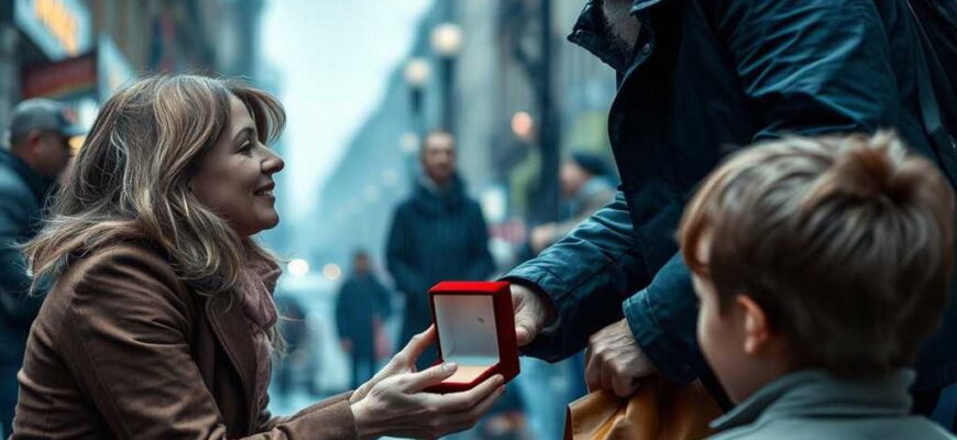 El cielo lloviznaba suavemente, como una fina cortina de lluvia, mientras la gente pasaba con paraguas abiertos y miradas bajas. Nadie reparó en la mujer de traje beige que, en medio del cruce, se arrodilló. Su voz temblaba. «Por favor cásate conmigo», susurró, sosteniendo una caja de terciopelo. El hombre al que le hacía la proposición llevaba semanas sin afeitarse, vestía un abrigo remendado con cinta adhesiva y dormía en un callejón a solo una cuadra de la Gran Vía.