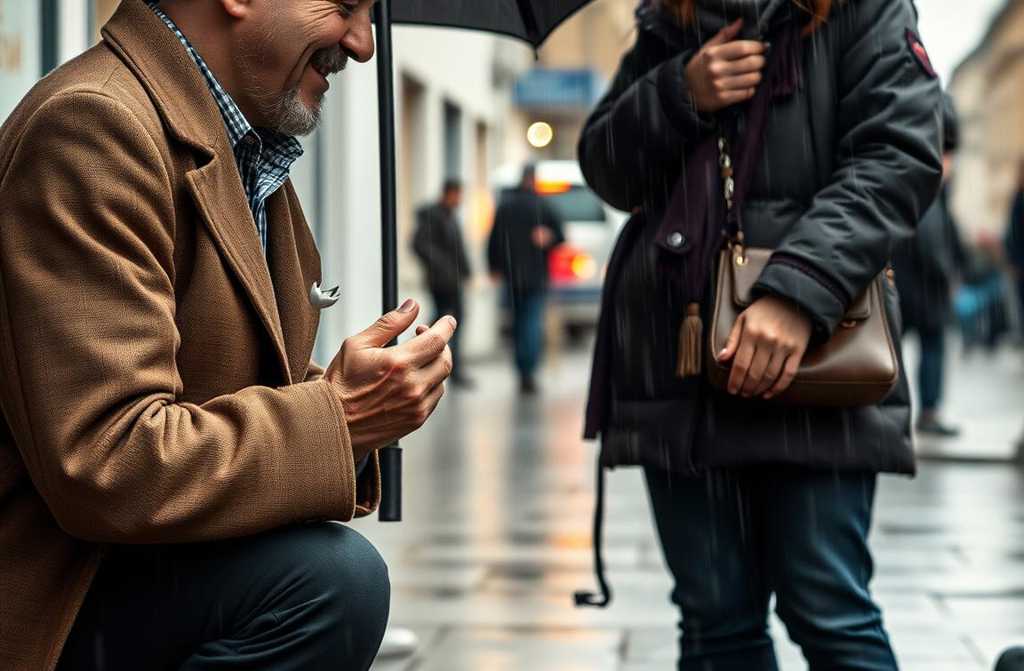 El cielo lloviznaba suavemente, como un delicado velo de lluvia, mientras la gente pasaba con paraguas abiertos y la mirada baja. Pero nadie prestó atención a la mujer vestida con un traje beige que, en medio del cruce, se arrodilló. Su voz temblaba. «Por favor cásate conmigo», susurró, sosteniendo una cajita de terciopelo. ¿El hombre al que le dirigía la propuesta? Llevaba semanas sin afeitar, vestía un abrigo remendado con cinta adhesiva y dormía en un callejón a solo una manzana de la Gran Vía.