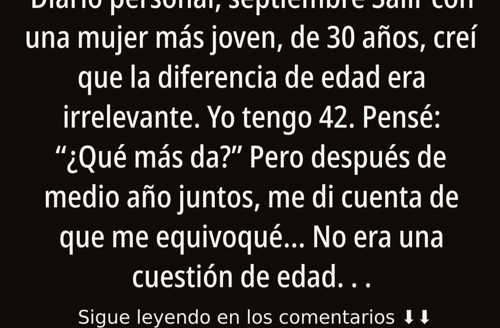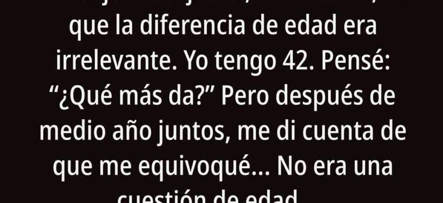 Salir con una mujer más joven, de 30 años, creí que la diferencia de edad era irrelevante. Yo tengo 42. Pensé: ¿Qué más da? Pero después de medio año juntos, me di cuenta de que me equivoqué No era una cuestión de edad física, sino de mundos distintos. Al final, la eché de casa tras una discusión que fue la gota que colmó el vaso.