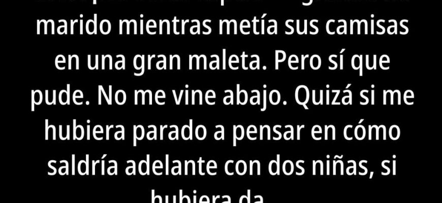 Pero sí que pude. No me vine abajo. Quizá si me hubiera parado a pensar en cómo saldría adelante con dos niñas, si hubiera dado rienda suelta a mis miedos, tal vez incluso le habría perdonado la infidelidad. Pero no tuve ese tiempo ni ese lujo: tenía que llevar a mis hijas al cole y salir corriendo al trabajo. Mi marido, tan satisfecho de sí mismo tras estrenar romance, había reaparecido en casa apenas media hora antes.