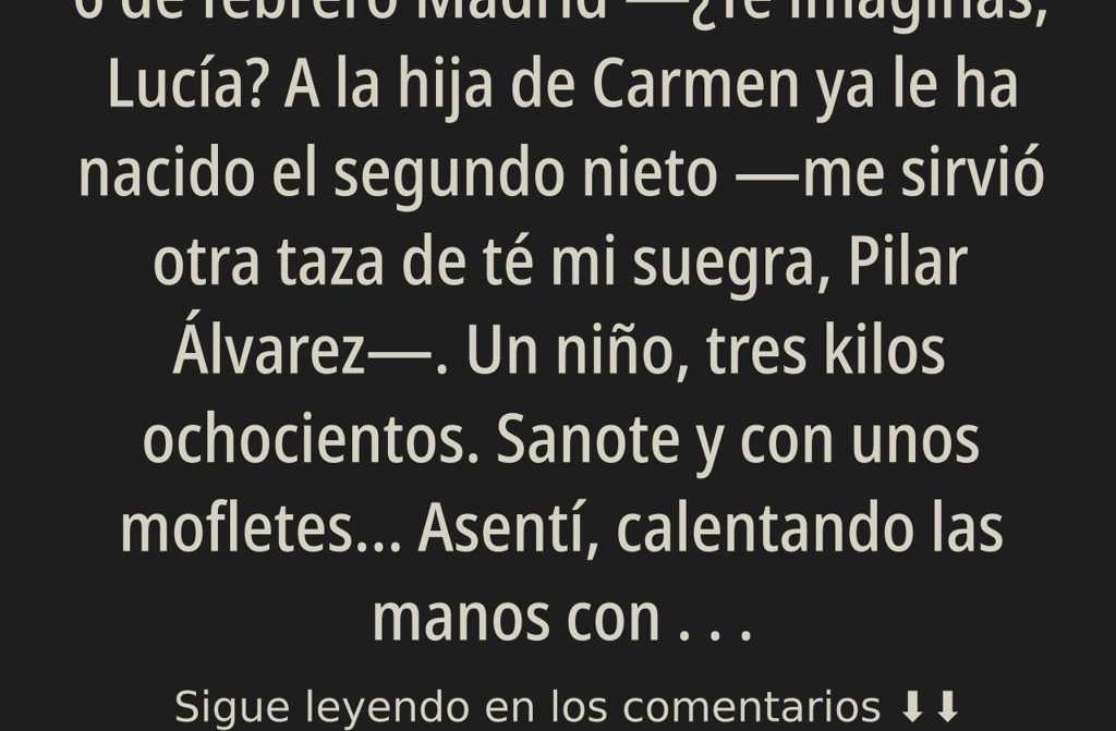 ¿Te imaginas, Lucía? A la hija de Carmen ya le ha nacido el segundo nieto me sirvió otra taza de té mi suegra, Pilar Álvarez. Un niño, tres kilos ochocientos. Sanote y con unos mofletes…