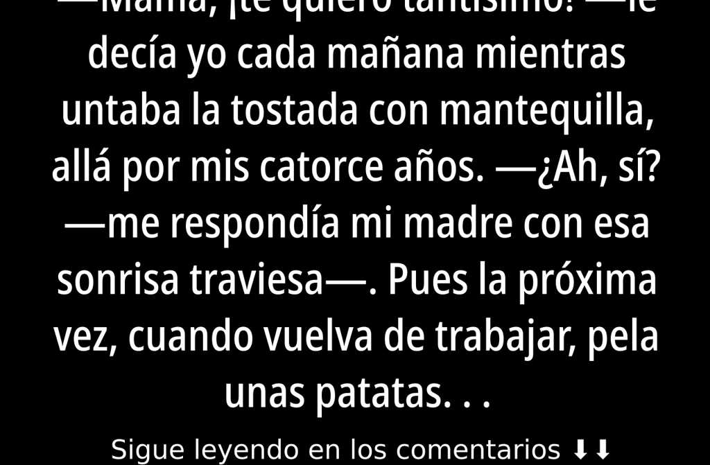 ¿Ah, sí? me respondía mi madre con esa sonrisa traviesa. Pues la próxima vez, cuando vuelva de trabajar, pela unas patatas. Así lo notaré sin necesidad de tantas palabras.