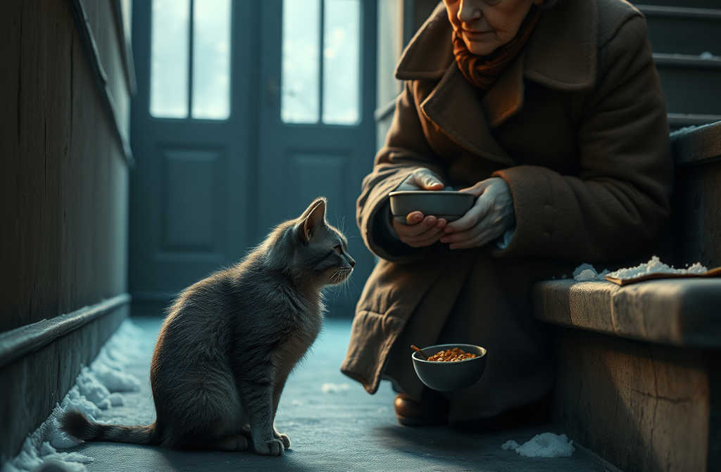 El gato, que había entrado con alguien, se arrinconó junto al radiador, apenas respirando. Su pelaje estaba helado, y sus ojos reflejaban súplica y agotamiento.