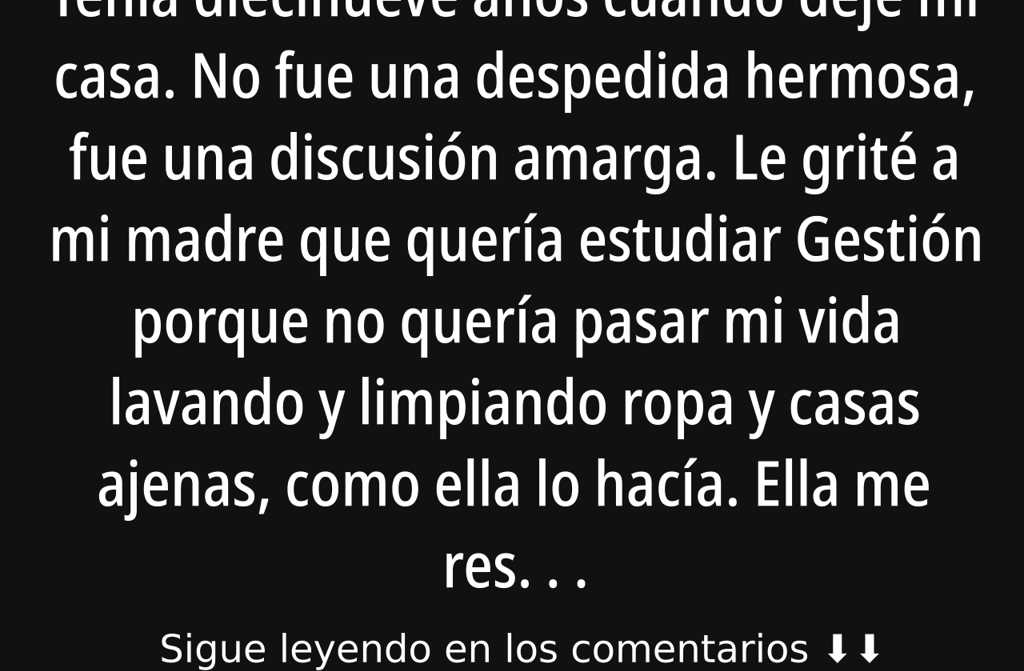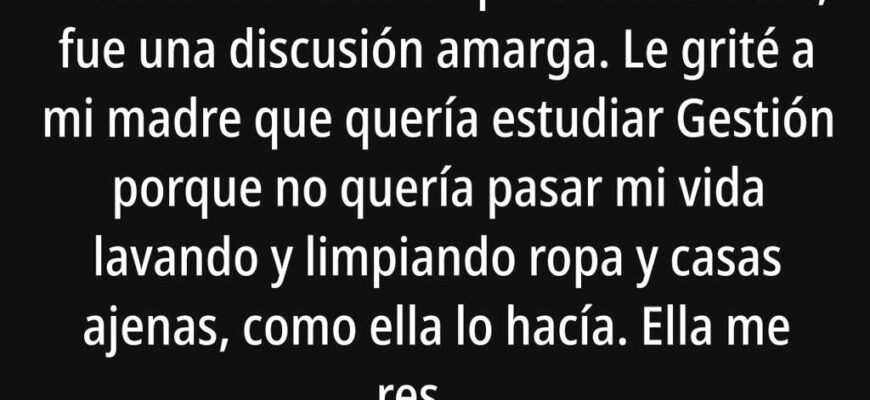 Tenía diecinueve años cuando dejé mi casa. No fue una despedida hermosa, fue una discusión amarga. Le grité a mi madre que quería estudiar Gestión porque no quería pasar mi vida lavando y limpiando ropa y casas ajenas, como ella lo hacía. Ella me respondió a voces, diciéndome que no era nadie para soñar tan alto, que mejor me callara, que las mujeres de nuestra familia siempre habían vivido así y que yo no iba a ser distinta. Aquel día, recogí mis cosas y fui a dormir a casa de una amiga.
