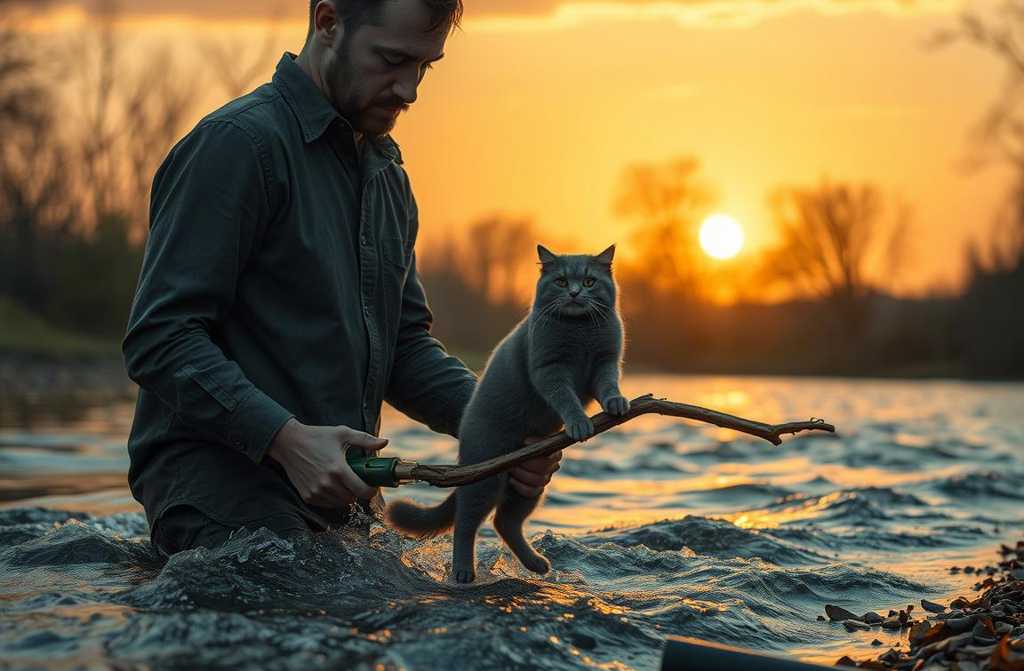 Se quitó la prótesis, la dejó a su lado y entrecerró los ojos para seguir el lento avance de un árbol caído que flotaba en el agua. ¿Se hundiría o no? A mitad de camino, quedó atrapado en un banco de arena. *”Atascado”*, concluyó Miguel. En diez minutos, cuando subiera la corriente, el agua lo arrastraría. Pero entonces notó algo extraño: entre las ramas, una pequeña criatura forcejeaba. Al acercarse, lo reconoció: era un gato. Gris, empapado, tembloroso, intentaba desesperadamente trepar. Ahora estaba en la rama más alta, a unos veinte metros de la orilla, aferrándose con las uñas.