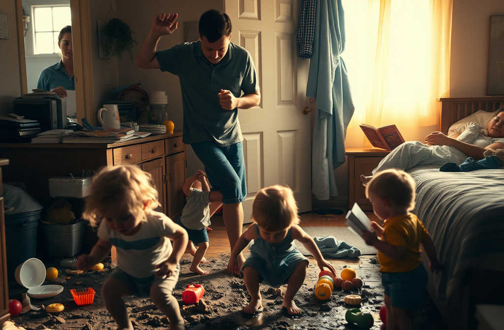 Julián entró en la casa, esquivando juguetes y envoltorios. Al cruzar el umbral, el caos se multiplicó. Una lámpara yacía en el suelo, la alfombra estaba arrugada y empujada contra la pared. En el salón, la televisión estaba a todo volumen, sintonizando un canal de dibujos, y el sofá era un mar de juguetes y ropa desperdigada.
