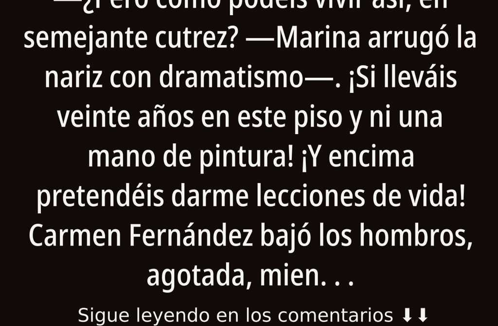 Marina quiso explicarse, justificar el desastre, pero no le salió nada. Solo la verdad desnuda, esa tan fea que tapó durante años con aires de superioridad. Dio un paso, luego otro, y se abrazó a Carmen con todas sus fuerzas. Se echó a llorar, los hombros sacudidos de sollozos, la cara apretada al hombro de su madre, que olía igual que antaño: aquel detergente barato del supermercado.